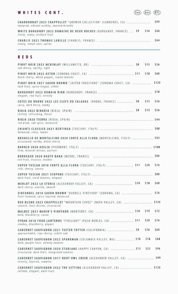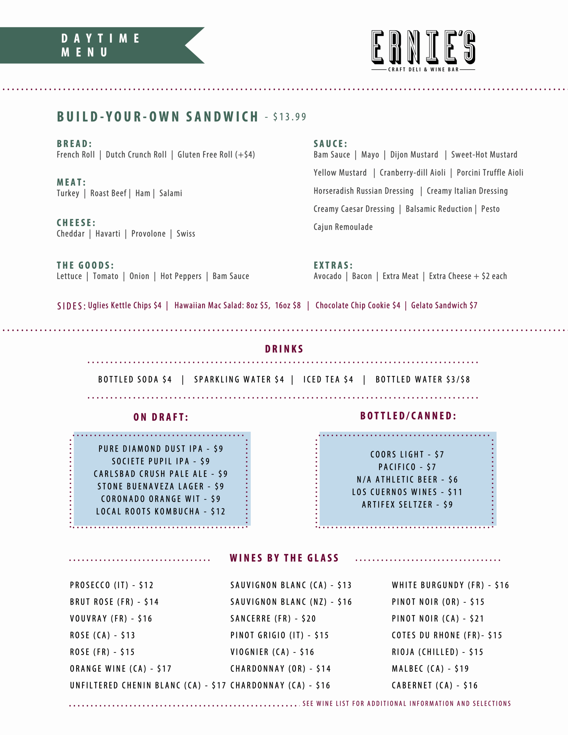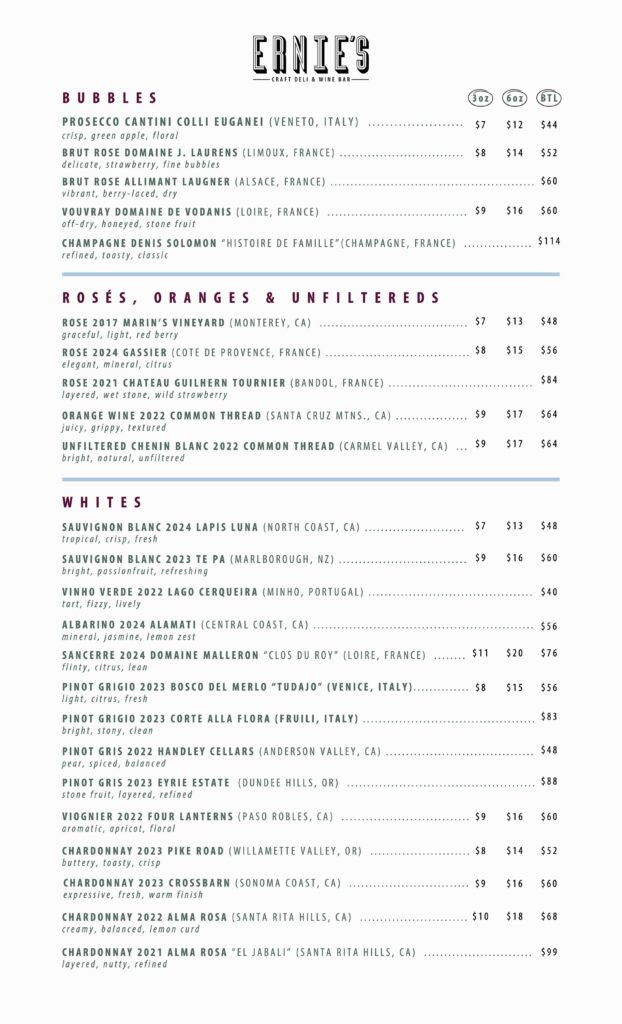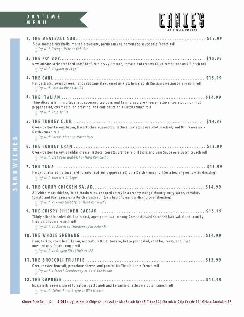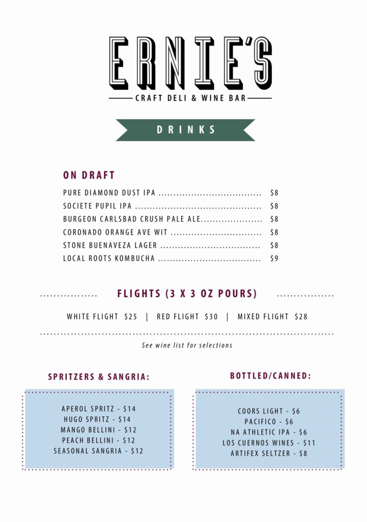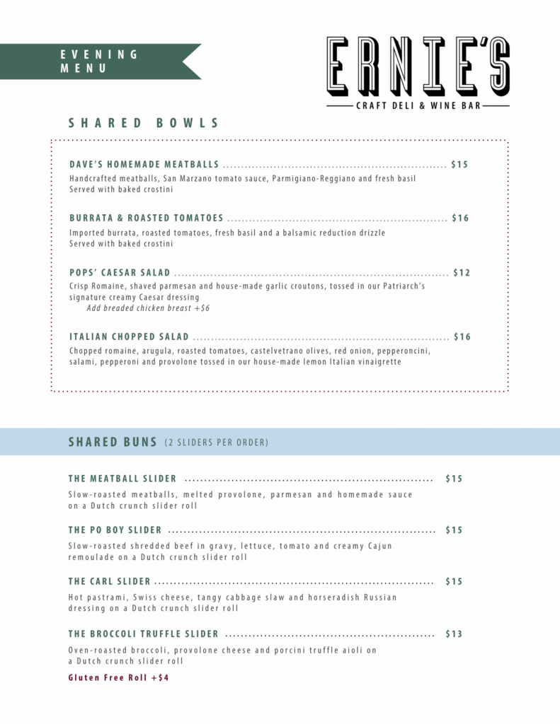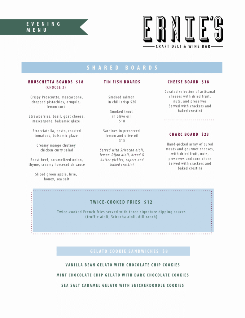 From daytime deli favorites to shared plates at night, Ernie’s prides itself on serving the best of the best! Each item has been carefully crafted and perfected (with many trials and errors) to earn it’s spot on the menu. Our wine list is extensive, yet approachable with options for all palates. Let our servers know your preferences and dietary needs and they can point you in the right direction.